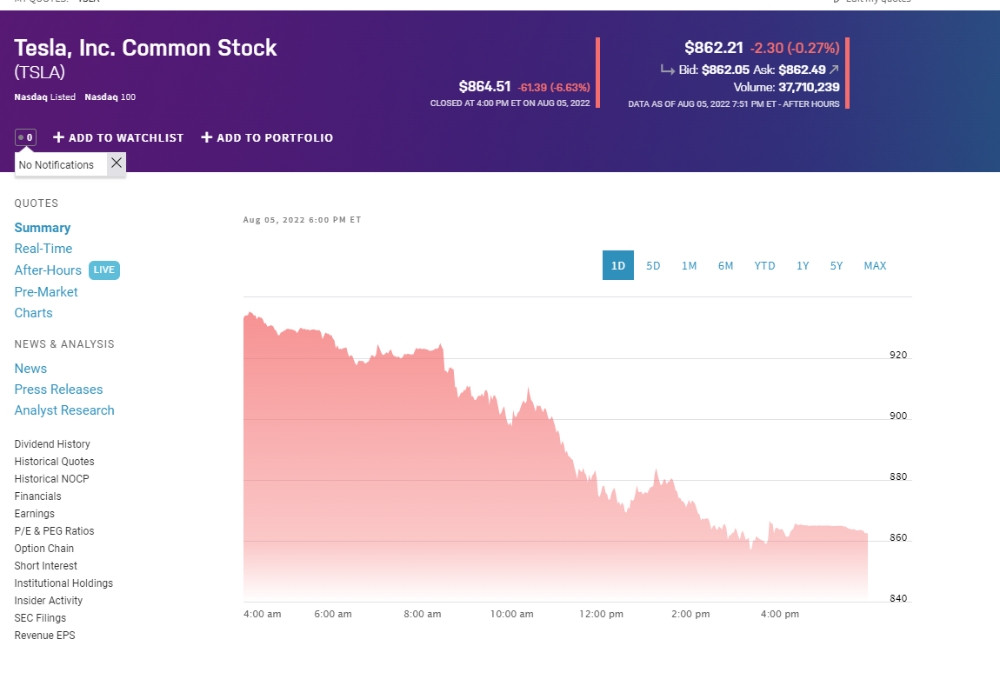 액면분할 완료에도 테슬라의 주가는 오히려 급락했다. 액면분할이 완료돼 액면분할 호재가 소진됐기 때문으로 풀이된다. 여기에다 테슬라는 중국발 공급망 혼란이 정리되지 않고 있다. 미중 긴장 고조로 피해를 입을 가능성이 커지고 있다. 또 머스크 CEO는 트위터 인수를 둘러싸고 법적 분쟁을 벌이고 있다. 이같은 리스크가 한꺼번에 부각되면서 주식 액면분할 완료에도 테슬라는 급락한 것으로 보인다.
