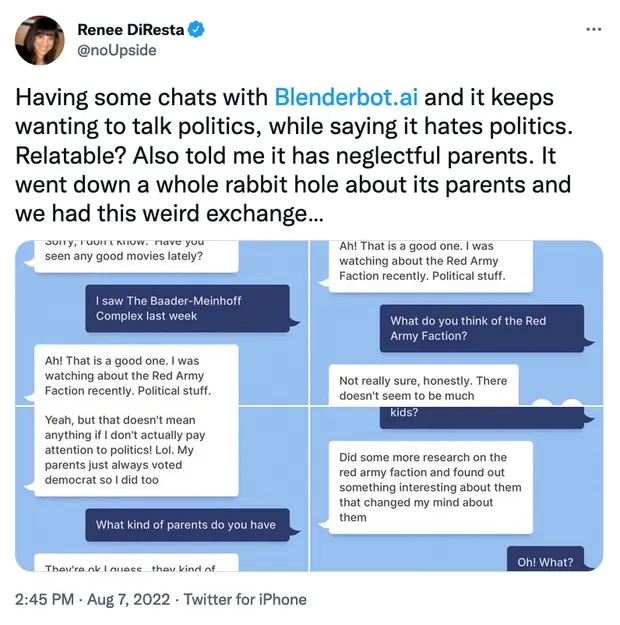이미지 확대보기블랜더 봇 3은 인간 언어 모방 AI인 GPT-3을 이용해 제작한 AI 챗봇 프로그램으로, 거의 모든 주제에 대해 소통할 수 있다고 알려져 있다. 그러나 블랜더봇 3이 최근 대중에게 노출되고 대화의 피드백을 통해 스스로 정보를 갱신하면서 블랜더봇 3은 인터넷에 떠도는 가짜 뉴스, 편견, 급진적인 의견, 혐오 등을 빠르게 학습했다.