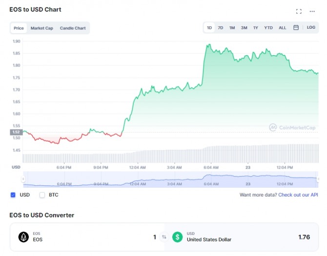 23일 이오스는 최대 1.89달러까지 치솟아 2달러를 재테스트 기대감을 높였다. 이오스는 올해 3월 1일 3.22달러로 사상 최고치를 기록했다. 이후 암호화폐 겨울로 불리는 5월 10일 1.74달러로 떨어진 뒤 지속적인 하락세를 보였다. 6월 19일 0.8324달러로 사상 최저치를 찍은 이오스는 서서히 회복하고 있다.