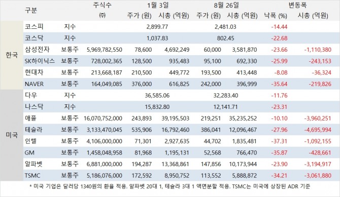 현대자동차가 연초보다 한자리수로 내려 국내외 주요 주식 가운데 가장 낮은 낙폭을 보이고 있고 네이버의 주가는 낙폭이 비교적 크게 나타났습니다.