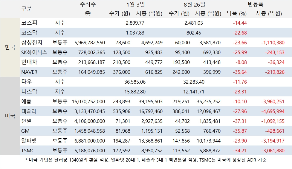 미국 주요 주식 가운데 가장 큰 시가총액을 차지하는 애플은 26일 종가 21만9251원으로 시가총액이 3523조5252억원 규모이며 연초보다 10.10% 하락했습니다. 미국 주요 주식에는 원/달러 환율 1340원이 적용됐습니다.
