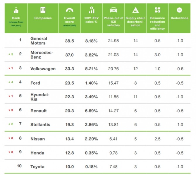 그 결과 탄소제로 평가 지수 100점 만점에서 38.5점을 얻은 GM이 으뜸을 차지한 것으로 나타났다. GM이 지난해 판매한 차량 가운데 ZEV가 차지하는 비중도 8.18%를 기록해 월등히 앞선 것으로 집계됐다. 내연차 퇴출과 관련한 평가 항목에서도 GM은 24.98점을 얻어 가장 좋은 점수를 받았다.