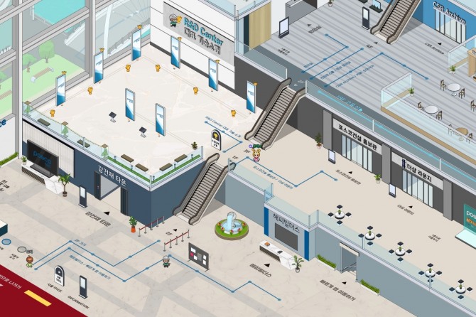 포스코건설 메타스페이스에 접속해 포스코건설 송도사옥으로 들어가면 1층에 여의도 파크원·광양 LNG 터미널 등 포스코건설의 대표 강건재 프로젝트를 둘러볼 수 있는 '강건재 타운'이 있다. 2층에 올라가면 '포스코건설 홍보관'과 '더샵 라운지'에서 포스코건설과 아파트 브랜드 더샵의 다양한 소식을 접할 수 있다. 3층과 4층에는 회의실·글로벌아카데미·컨퍼런스홀 등 회의·사내교육·행사를 위한 공간이 마련됐다.