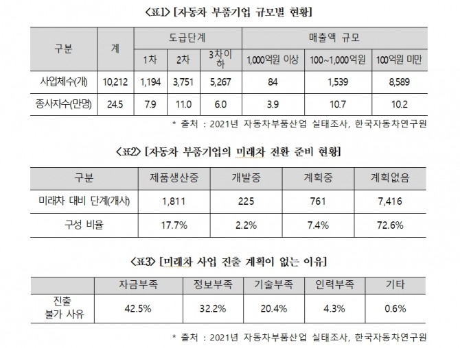실제 국내 자동차 부품사는 미래차로의 전환에 빠르게 대응하지 못하고 있다. 이날 한국자동차연구원 자료에 따르면 2020년 기준 국내 자동차 부품사 총 1만212개 중 7416개사(73%)는 자금·기술·정보 부족 등의 사유로 미래차 전환 계획을 전혀 수립하지 못하고 있다.