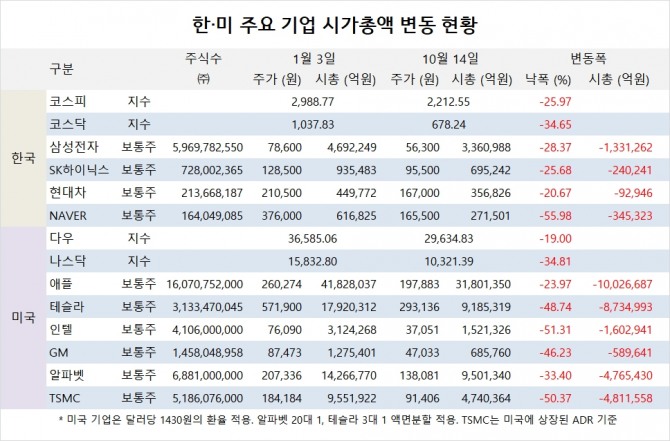 SK하이닉스는 이날 9만5500원으로 연초보다 25.68% 내렸고 현대자동차의 주가가 16만7000원으로 연초보다 20.67% 하락하며 20%대의 낙폭에 접어들었습니다. NAVER의 주가가 16만5500원으로 55.98% 떨어졌니다.