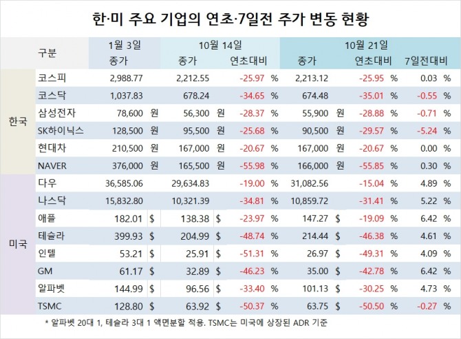 SK하이닉스는 9만500원으로 연초보다 29.578% 내렸고 일주일 동안 5.24% 떨어졌습니다. 현대자동차의 주가는 16만7000원으로 연초보다 20.67% 하락했고 일주일 동안 등락이 있었지만 원위치했습니다.
