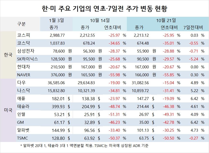 코스피 지수는 10월 21일 2213.12로 연초인 1월 3일에 비해 25.95% 내렸고 지난 일주일 새 0.03% 올랐습니다. 코스닥 지수는 674.48로 연초보다 35.01%, 일주일 새 0.55% 내렸습니다.