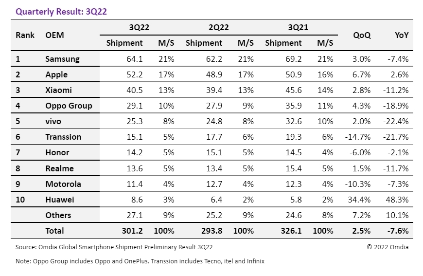 이미지 확대보기시장조사업체 옴디아에 따르면 올해 3분기 전 세계 스마트폰 출하량은 총 3억 120만대로 전년 동기 대비 7.6% 감소했다. 중국의 주요 세트 OEM(주문자 상표 부착)은 전년 대비 큰 폭의 마이너스 성장을 기록했으며 샤오미, 오포, 비보, 트랜션, 리얼미 등은 모두 출하량이 두 자릿수 감소했다.