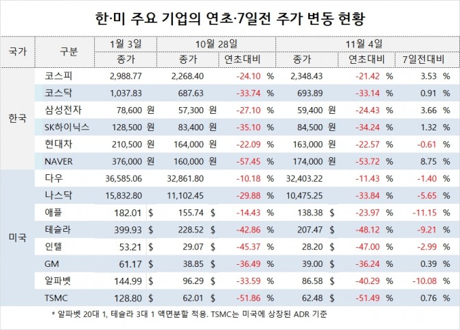 SK하이닉스는 8만4500원으로 연초보다 34.24% 내렸고 일주일 동안 1.32% 올랐습니다. 현대자동차의 주가는 16만3000원으로 연초보다 22.57% 하락했고 일주일 0.61% 내렸습니다.