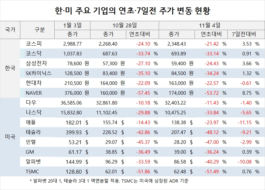 코스피 지수는 11월 4일 2348.43으로 연초인 1월 3일에 비해 21.42% 내렸고 지난 일주일 새 3.53% 올랐습니다. 코스닥 지수는 693.89로 연초보다 33.14% 하락했고 일주일 새 0.91% 상승했습니다.