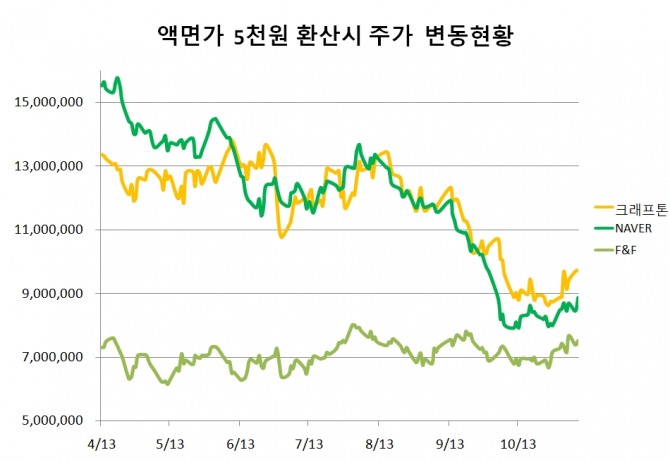 뒤를 이어 F&F는 환산주가 752만5000원을 기록해 줄곧 3위를 유지하고 있다.