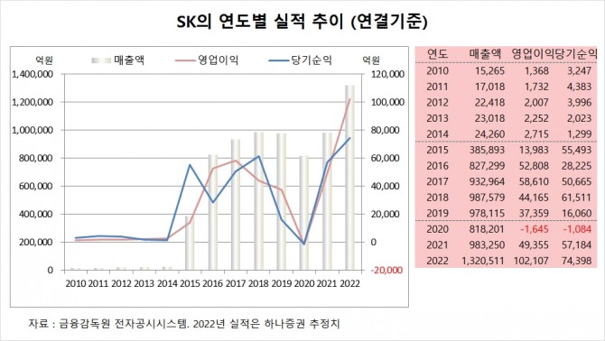 SK는 2015년 8월 SK C&C가 SK를 합병하고 SK로 사명을 바꾸면서 매출액이 급증했습니다.