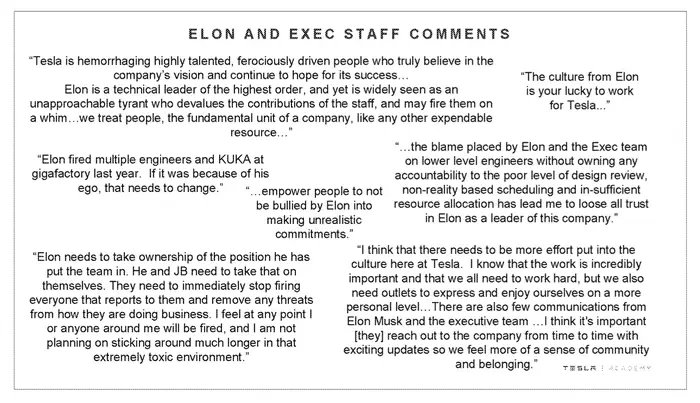 이 설문조사 결과에 따르면 머스크를 비롯한 경영진에 대한 당시 테슬라 임직원의 평가는 후하지 않았다.