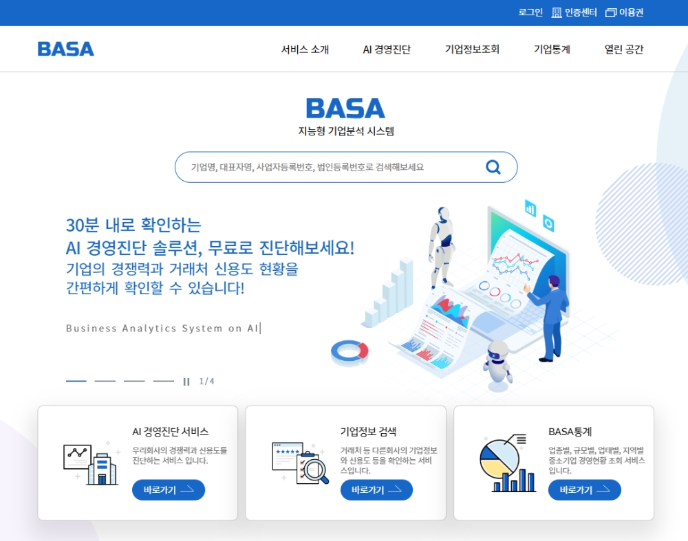 새로 오픈된 BASA 포털을 통해 이용자들은 △AI 경영진단 △기업정보조회 △기업통계 서비스 등을 기업경영에 활용할 수 있다.