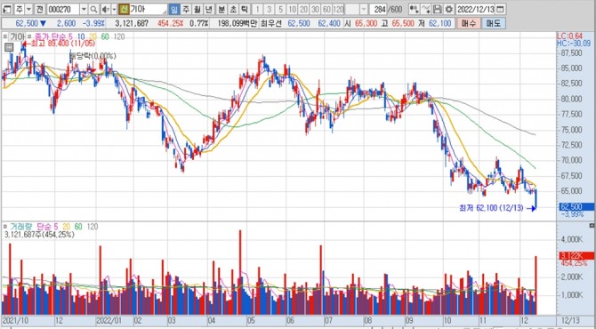 이미지 확대보기기아의 주가는 이날 전일보다 2600원(3.99%) 내린 6만2500원에 장을 마쳤습니다. 장중에는 52주 최저가인 6만2100원을 찍었습니다.