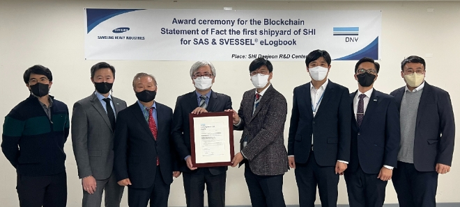 이는 삼성중공업이 선박의 중요한 디지털 정보를 해·육상간 주고 받을 때 제 3자가 이를 위·변조 하는 등의 정보 조작을 하지 못하도록 하는 보안 솔루션을 선 보인 것으로, 조선 분야에서는 처음으로 블록체인 기술이 적용됐다.