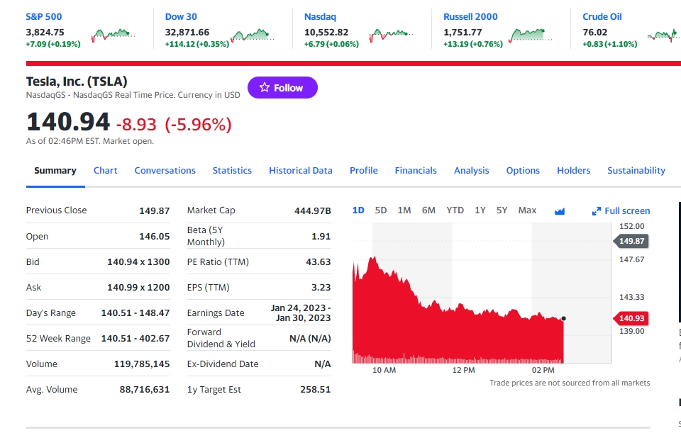 미국 전기자동차 업체 테슬라 주가가 140달러 붕괴를 눈앞에 두고 있다. 테슬라 주가는 최고경영자(CEO) 일론 머스크 때문에 장중 큰 변동성을 보였다. 머스크는 전날 "트위터 대표직에서 물러나야 하는가"라고 묻는 온라인 투표를 자신의 트위터 계정에서 진행했고, 조사를 마감한 결과 트위터 CEO 사퇴에 찬성하는 의견(57.5%)이 반대(42.5%)보다 많았다. 머스크의 트위터 인수 이후 테슬라에 불거진 악재를 해소할 수 있다는 기대감이 주가를 잠시 끌어올렸지만, '트위터 CEO 사퇴' 조사 결과를 놓고 머스크가 침묵을 지키자 주가는 다시 약세로 전환했다. 뉴욕증시에서는 머스크가 트위터에서 각종 논란으로 테슬라 경영을 소홀히 했고 회사의 브랜드 가치마저 훼손하고 있다는 비판을 이어갔다.