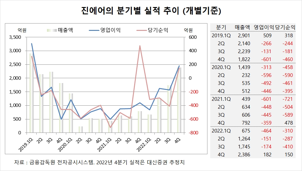 대신증권은 진에어의 올해 4분기 개별기준 매출액이 2386억원, 영업이익이 182억원, 당기순이익이 150억원에 이를 것으로 내다보고 있습니다. 진에어의 4분기 영업이익은 시장 컨센서스인 30억원을 크게 웃돌 전망입니다.