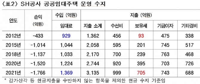 공사에 따르면 SH공사 공공임대주택에 부과된 재산·종합부동산세 등 보유세는 2021년 705억원(재산세 320억원, 종부세 385억원)으로 전년대비 각각 1.2배, 2.9배 증가했다.