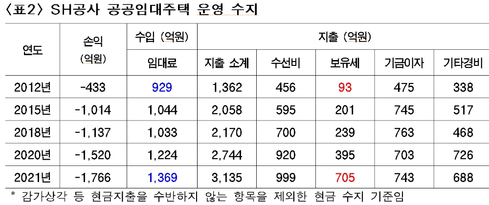 SH공사의 임대주택은 시중 임대주택과 같은 수준으로 임대료를 책정할 경우 약 1조6000억원의 수입이 발생한다. 하지만, 실제 SH공사의 2021년 임대료 수입은 1400여억원에 불과하다. 임대료 없는 장기전세주택 보증금을 정기예금금리로 환산한 금액 600억원을 더해도 2000억원 정도로 시세 대비 8분의 1에 지나지 않는다는 게 SH공사 측 설명이다.