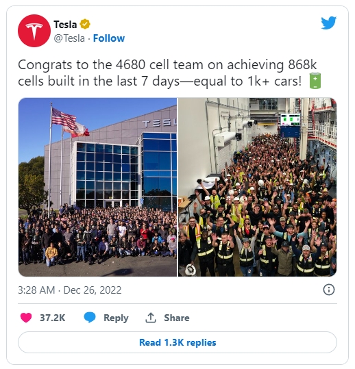 테슬라가 25일(현지시간) 트위터를 통해 처음으로 발표한 4680 배터리 양산 현황. 사진=트위터