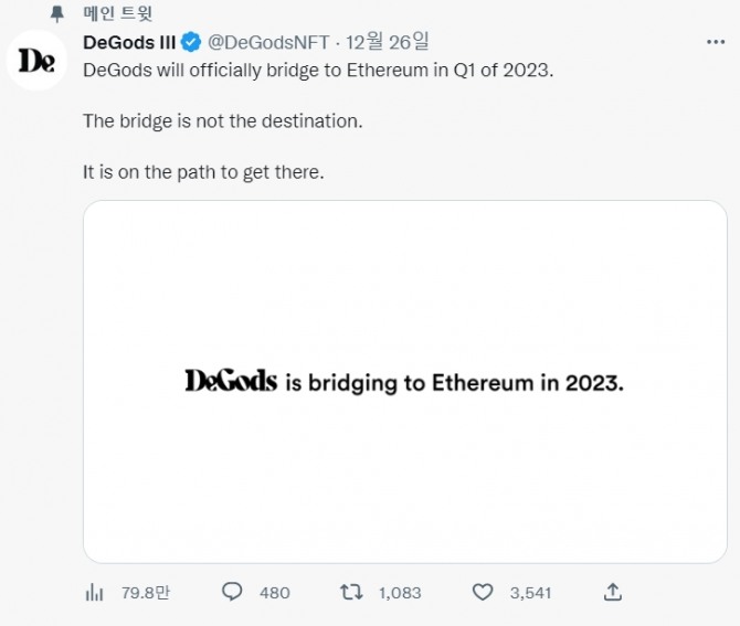 디갓 팀은 26일 트위터에서 "Degods은 2023년 1분기에 공식적으로 이더리움에 브리지할 것이다. 브리지는 목적지가 아니고 거쳐 가는 길에 있다"고 말했다.
