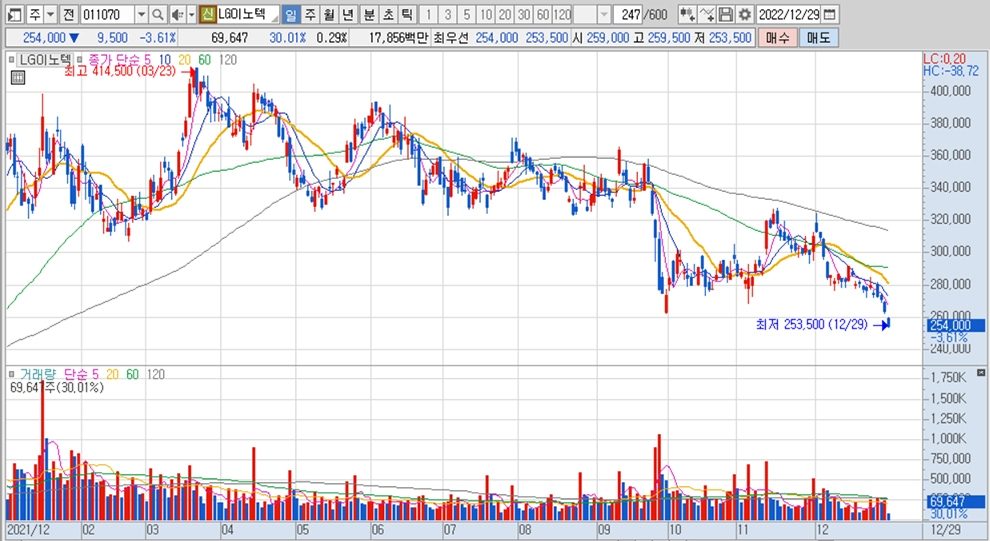 이미지 확대보기LG이노텍은 주요 고객사인 애플이 52주 신저가를 경신하자 덩달아 52주 신저가를 달리고 있습니다.