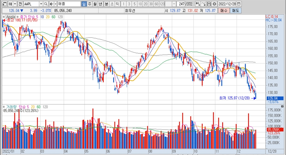 애플의 주가는 경기 침체로 인한 수요 부족으로 지난 28일(현지시간) 전일보다 3.99 달러(3.07%) 내린 126.04 달러에 장을 마감했습니다. 장중에는 최저가 125.87 달러를 기록하며 52주 최저가를 경신했습니다.
