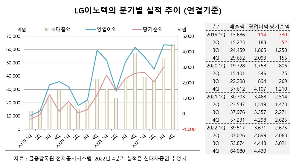 LG이노텍은 올해 3분기 연결기준 매출액이 5조3874억원, 영업이익이 4448억원, 당기순이익이 3021억원을 기록했습니다.