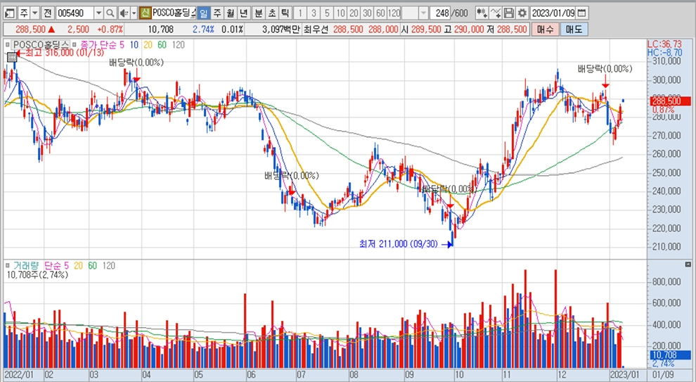 하나증권은 포스코홀딩스가 올해 1분기를 기점으로 하반기로 갈수록 본격적인 실적개선이 가능할 것으로 기대되고 중장기적으로 리튬을 비롯한 신사업 모멘텀도 유효할 것으로 판단해 포스코홀딩스에 대해 투자의견 매수와 목표주가 45만원을 그대로 유지했습니다.