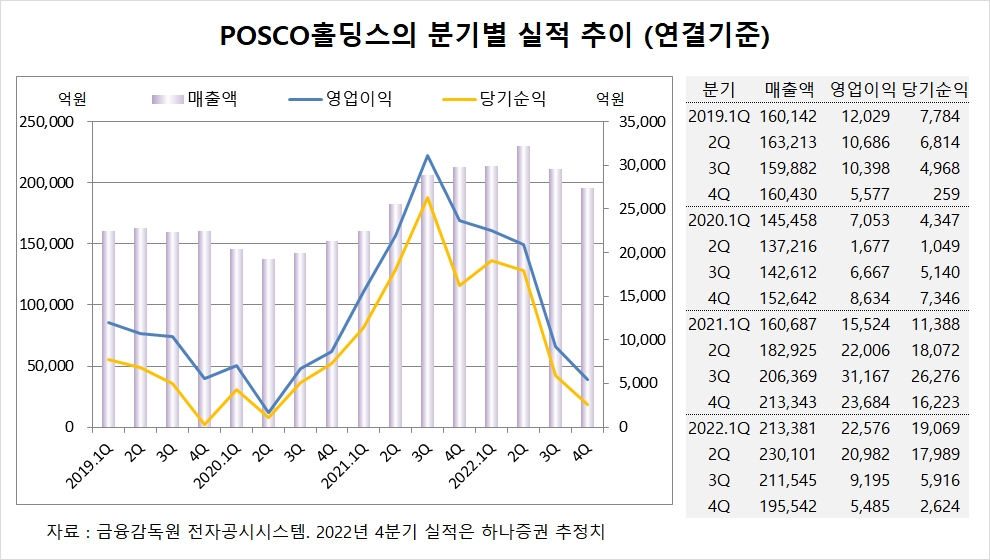 이미지 확대보기하나증권은 포스코홀딩스의 지난해 4분기 연결기준 매출액이 19조5542억원, 영업이익이 5485억원, 당기순이익이 2624억원에 이를 것으로 전망하고 있습니다.