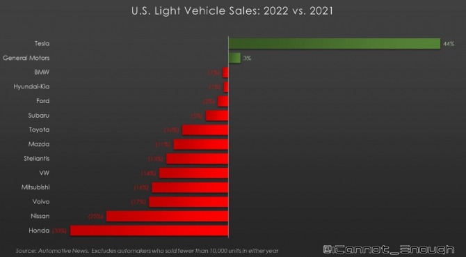 머스크가 올린 그래픽 자료는 미국 자동차 매체 오토모티브뉴스가 최근 낸 기사에 포함된 것으로 주요 자동차 메이커의 지난해 경형 자동차(light vehicle) 판매실적과 2021년 판매실적을 비교한 그래픽이었다. 경승용차로도 불리는 경형 자동차는 통상 SUV를 비롯한 승용차와 중량 3.5t 미만의 소형 상용차를 아우른다.