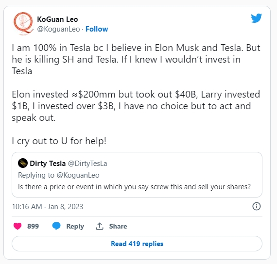 그는 “머스크와 테슬라에 대한 믿음이 있기에 그동안 테슬라에 100% 올인해왔지만 머스크가 지금 주주들과 테슬라를 죽이고 있다”면서 “머스크가 이런 사람인줄 알았다면 테슬라에 투자하지 않았을 것”이라며 이같이 주장했다.
