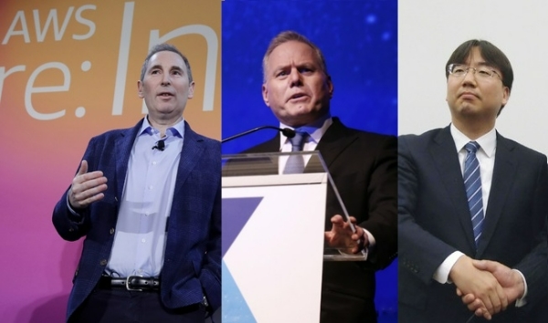 이미지 확대보기왼쪽부터 앤드루 재시 아마존 대표·데이비드 자슬라프 워너브라더스 디스커버리 대표·후루카와 슌타로 닌텐도 대표. 사진=AP통신·뉴시스
