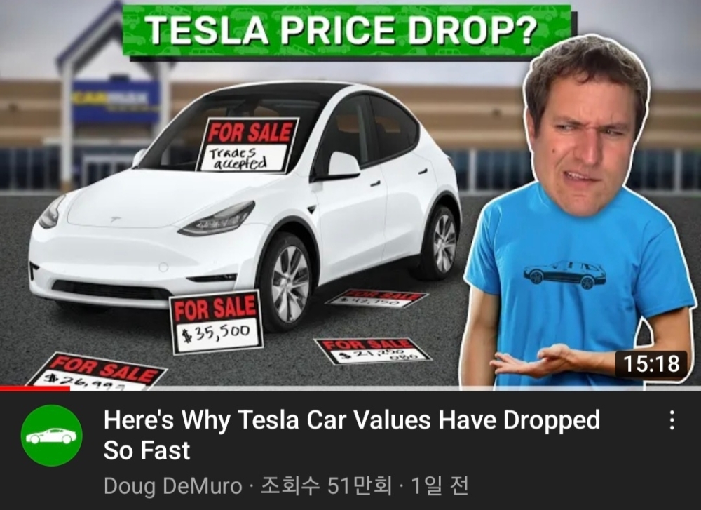 이미지 확대보기이날 현재 무려 51만회의 경이적인 조회수를 기록한 이 영상에서 디뮤로는 테슬라 중고 전기차 가격이 “물 속에 던진 돌멩이가 가라앉듯 속절없이 떨어지고 있지만 사람들이 흔히 생각하는 이유 때문은 아니다”며 자신의 분석에 근거해 그 이유를 제시했다.