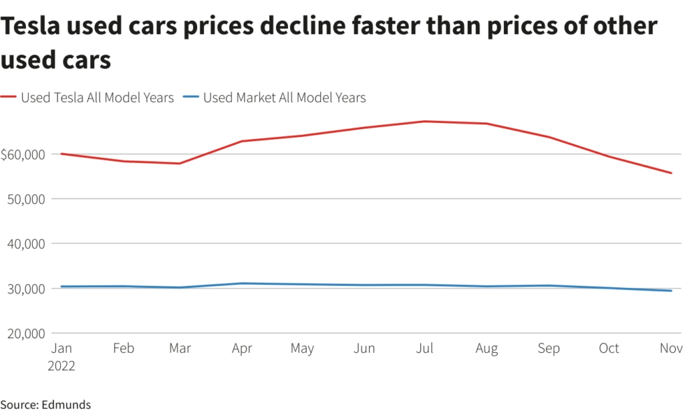실제로 로이터통신에 따르면 중고 테슬라 전기차 가격은 지난해 7월 정점을 찍은 뒤부터 떨어지기 시작해 지난달 기준으로 전년 동기 대비 17%나 급락한 상황이다.
