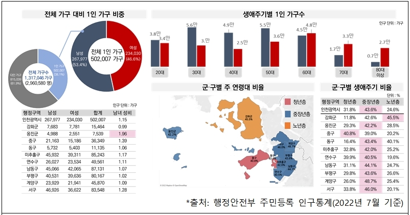 한편, 지난해 12월 기준 행정안전부 주민등록 인구통계에 따르면 인천시의 1인가구는 약 50만가구로 전체가구의 38.1%로 나타났으며, 전국 평균 41.0%, 서울시의 43.9%, 경기도의 37.2%가 1인가구다