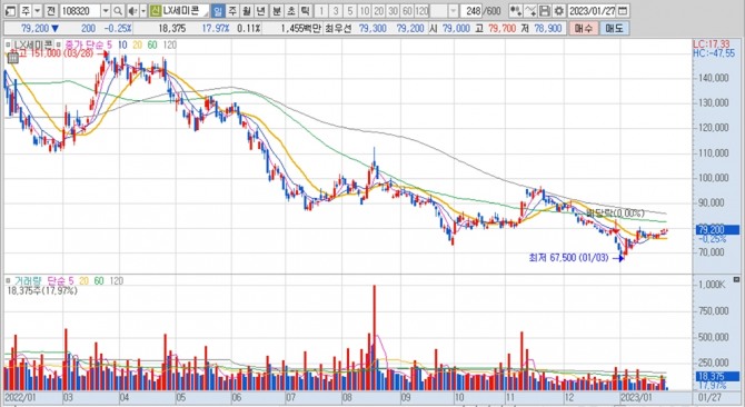 이미지 확대보기LX세미콘의 주가는 27일 오전 9시 3분 현재 전일보다 200원(0.25%) 내린 7만9200원에 거래되고 있습니다.
