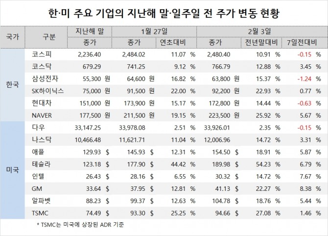 현대자동차의 주가는 17만2800원으로 일주일 새 0.63% 내렸고 지난해 말에 비해 14.44% 상승했습니다. NAVER의 주가는 22만3500원으로 일주일간 5.67%, 지난해말보다 25.92% 각각 상승했습니다.