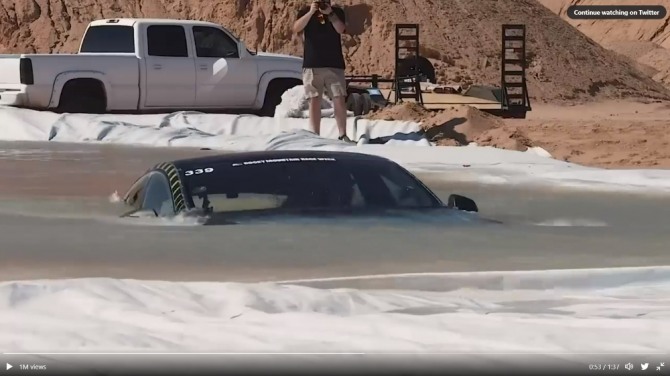 이미지 확대보기4일(현지시간) 자동차 전문매체 카스쿱(Carscoop)에 따르면, 첼린(Chellin)이라는 유튜브 아이디를 사용하는 테슬라 모델S의 소유주는 지난해 9월 실시한 방수테스트 영상을 재공유했다. 방수능력을 테스트하기 위해 첼린은 인공호수를 만들고 물을 채운 후 승객실을 밀폐한 뒤 테슬라 모델S를 타고 도강을 시도했다. 차량이 물에 들어간 지 얼마 지나지 않아 모델S의 앞유리 전체를 거의 덮었고 실내로 조금씩 물이 유입되기 시작했다. 그럼에도 불구하고 테슬라의 모델S는 무사히 도강을 끝낼 수 있었다.
