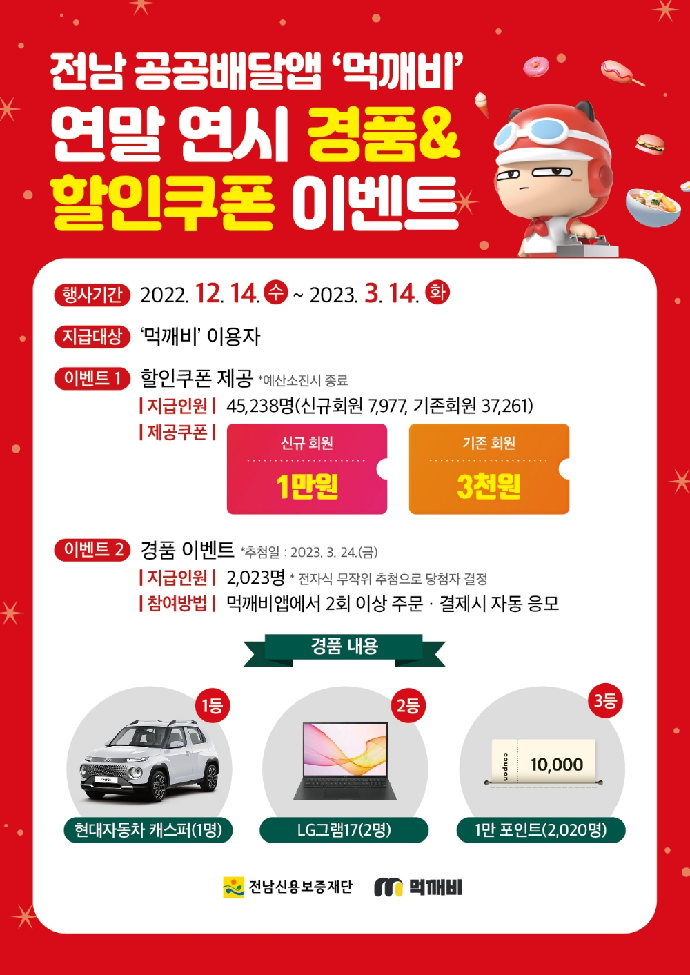 이미지 확대보기전라남도가 공공배달앱 ‘먹깨비’의 이용 활성화를 위해 오는 3월 14일까지 이용자 대상 푸짐한 경품 이벤트를 진행하고 있다.