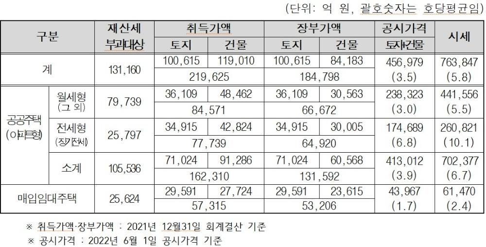 SH공사가 보유한 주택·건물 등 취득가액은 21조9625억원이며, 장부가액은 18조4798억원이다. 공시가격은 총 46조원 정도이다.