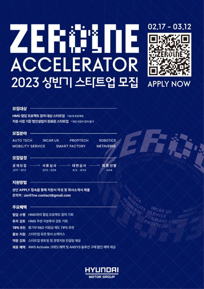 이미지 확대보기현대자동차그룹이 오픈이노베이션 플랫폼 ‘제로원 액셀러레이터(ZERO1NE ACCELER ATOR)’의 2023년 상반기 스타트업 공개 모집을 시작했다고 20일 밝혔다.