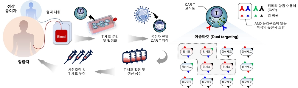 CAR-T 세포치료제의 제작 및 투여 과정과 CAR를 이용한 암세포 특이적 이중타겟 모식도. 사진=KAIST