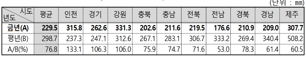 남부지역 누적 강수량 평년 62%로 전국 77% 밑돌아