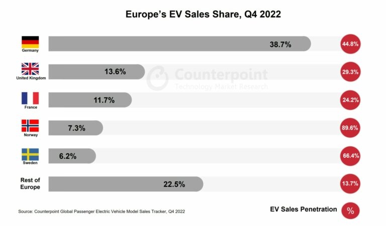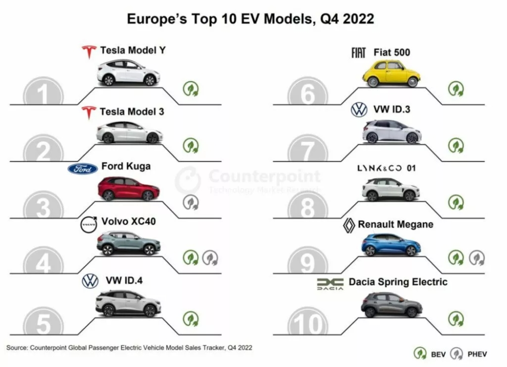 19일(이하 현지시간) 카스쿱스에 따르면 글로벌 시장조사업체 카운터포인트리서치가 2022년 4분기 유로존의 전기차 판매현황을 조사한 결과 테슬라 모델Y와 모델3가 판매실적을 크게 늘리면서 유로존의 전기차 판매량이 전년 동기 대비 34% 증가한 것으로 나타났다.