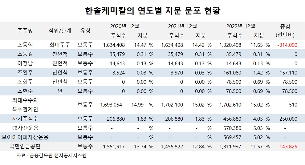 이미지 확대보기한솔케미칼은 조동혁 회장의 장녀 조연주 부회장이 지분 1.42%를 갖고 있습니다.