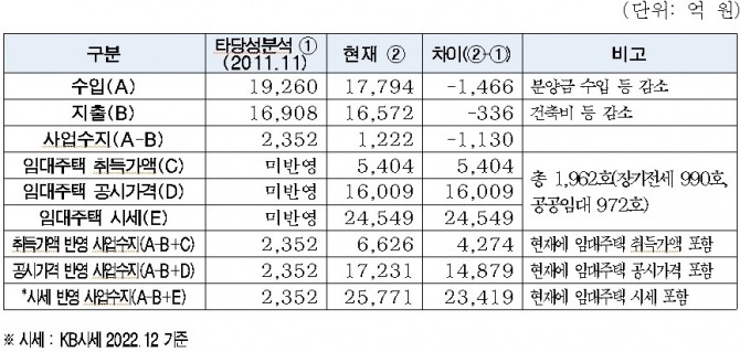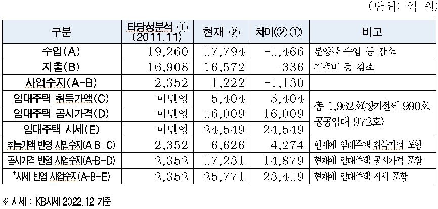 세곡2지구 투자비는 건축비 등의 감소로 사업성 검토 당시와 비교해 336억원 감소했다. 또한 임대주택 자산가치 2조4549억원이 추가 반영돼, 개발이익은 사업 착수 당시 목표로 했던 2352억원에서 2조5771억원으로 11배 증가했다.