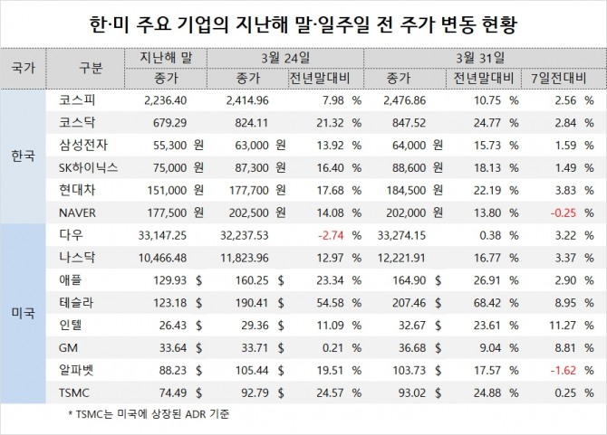 현대자동차의 주가는 18만4500원으로 일주일 새 3.83% 올랐고 지난해 말에 비해서는 22.19% 상승했습니다. 네이버의 주가는 20만2000원으로 일주일간 0.25% 내렸고 지난해 말보다 13.80% 올랐습니다.