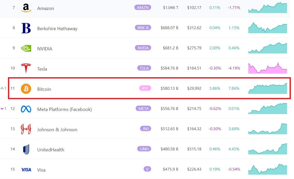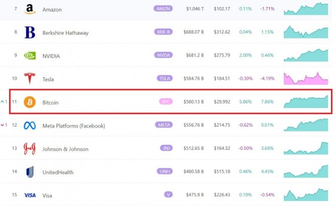 비트코인이 4000만원 턱 밑까지 오르면서 비트코인의 시총은 11일 오전 11시 기준 5800억달러(약 764조원) 를 돌파했다. 전세계 주요 자산 순위를 매기는 인피니트마켓캡에 따르면 비트코인은 단일 자산 규모 11위로 뛰어올라 메타(페이스북, 5567억달러)보다 높고 테슬라(5847억달러)보다 낮은 상태다.